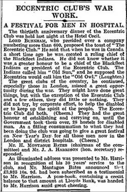 During the First World War, the members of the Eccentric were entertaining the troops on the frontline, raised over £25,000 for the limbless soldiers, regularly visited the wounded soldiers in the hospitals and distributed amongst them food, tobacco and pipes. At the same time, a number of hospitals, hostels and orphanages were built by the Club.